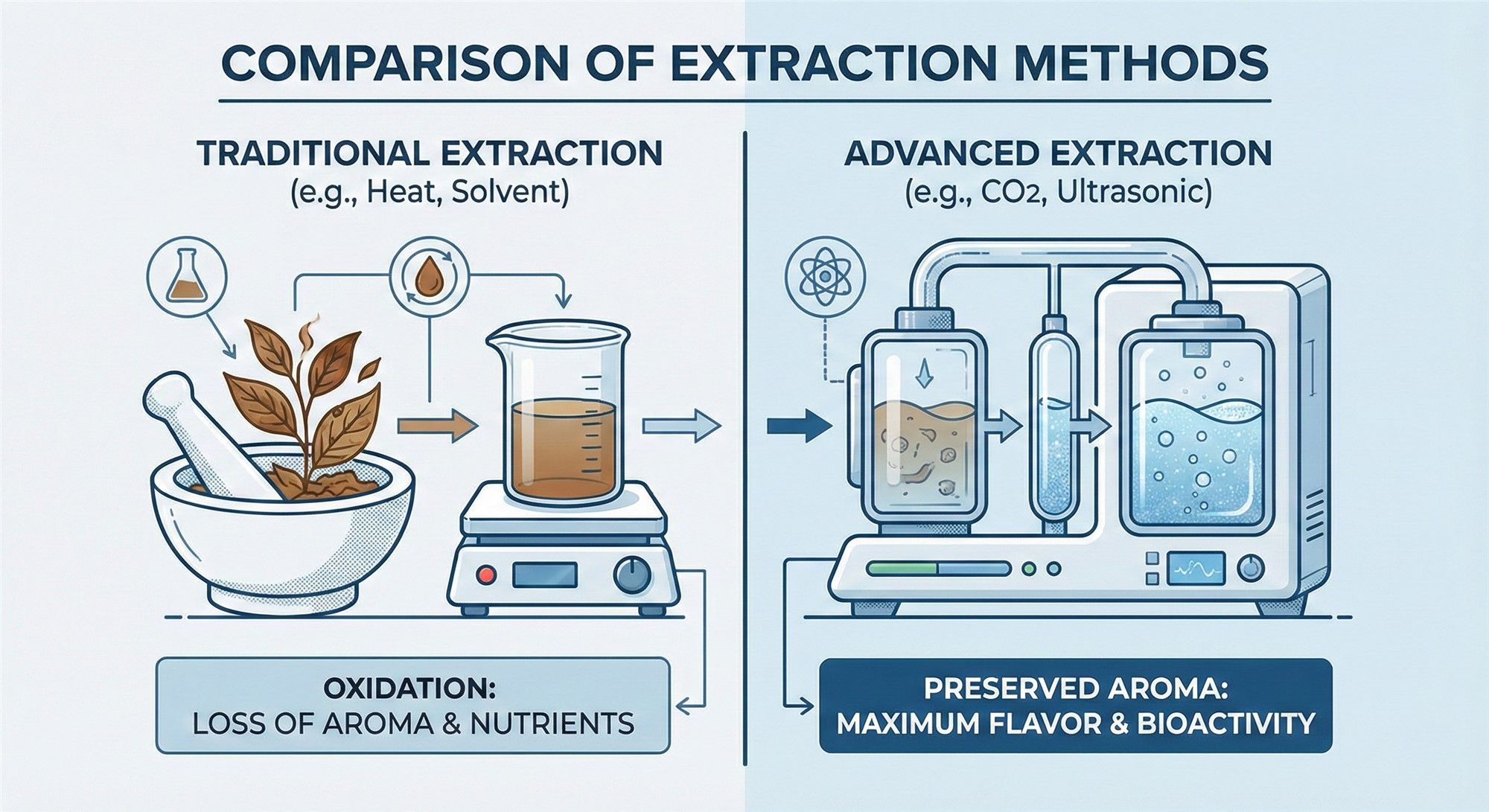 Preserving the delicate 'soul' of botanical ingredients requires more than just raw material—it requires precision engineering. In this technical guide, we explore 4 advanced extraction methodologies, including Supercritical CO2, Low-Temperature Purge & Trap, and Controlled Freeze-Thaw. Discover how we overcome oxidation and thermal degradation to deliver natural extracts with authentic, full-bodied flavor profiles.