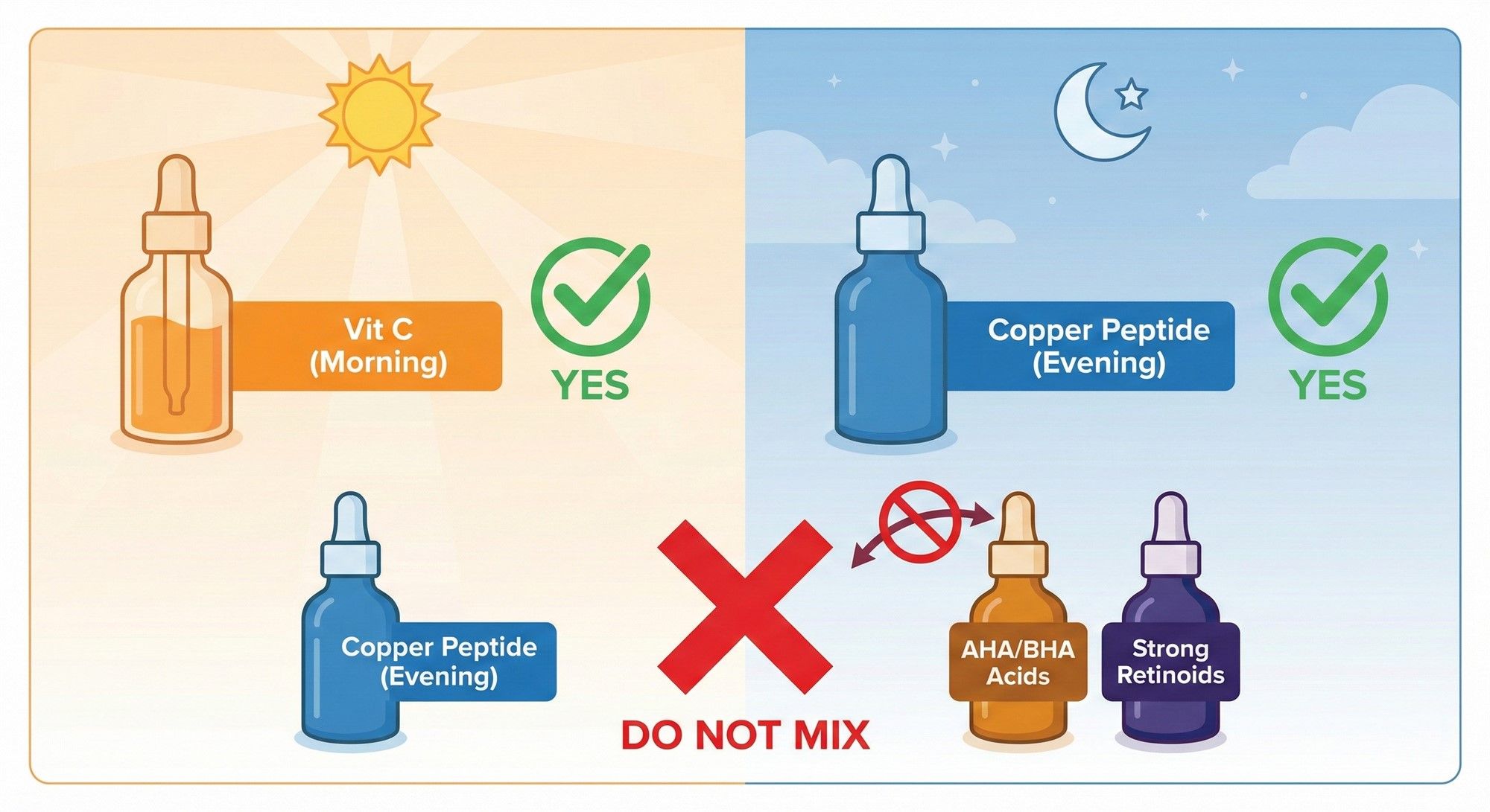 Visual guide for combining Copper Peptides with Vitamin C and avoiding acid conflicts.